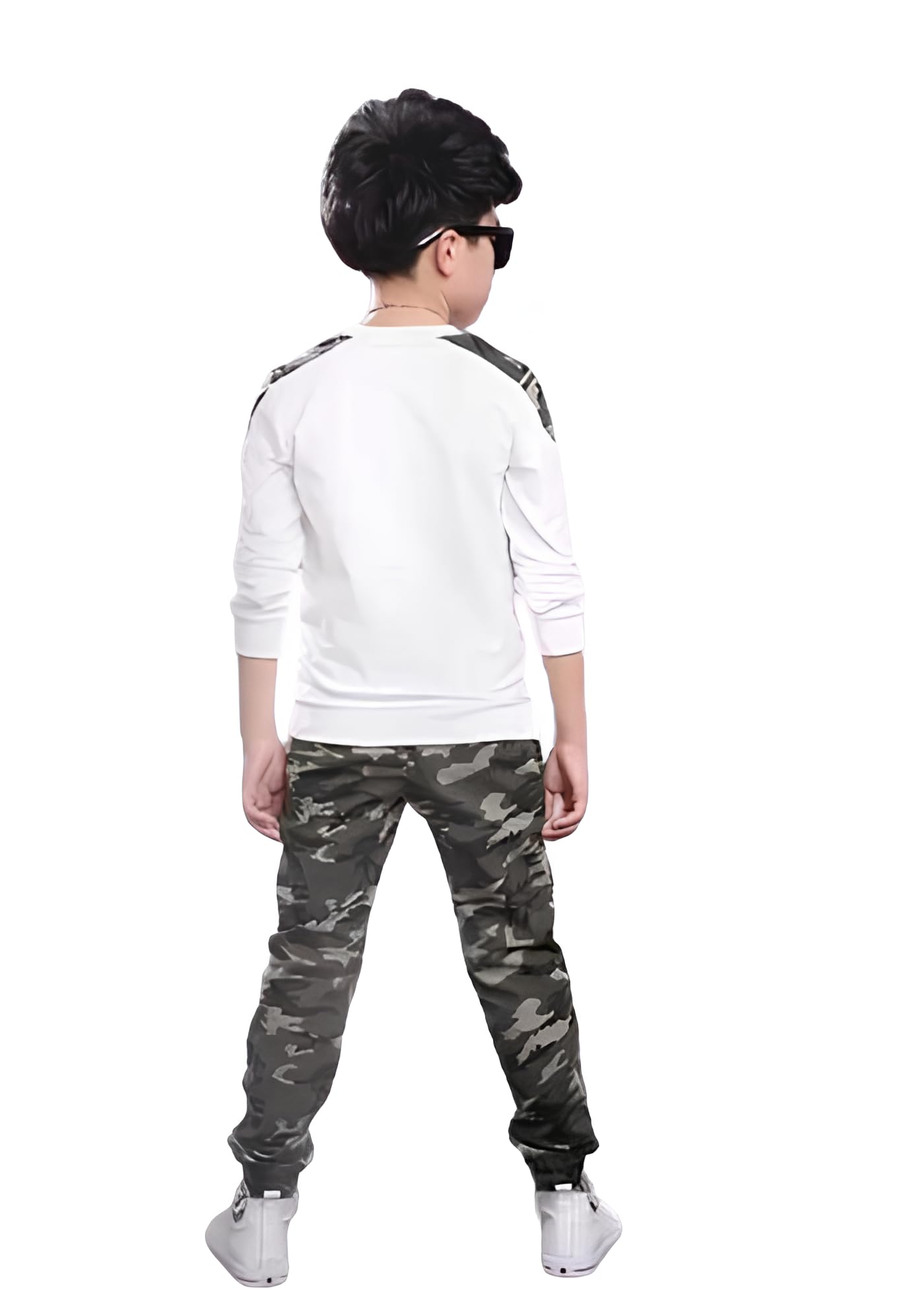 Boys Cotton Blend Solid Sagar Impex Camouflage T-Shirt And Trouser Set, Full Sleeves, Round Neck, 4-12 Years (White, 7-8 Year)