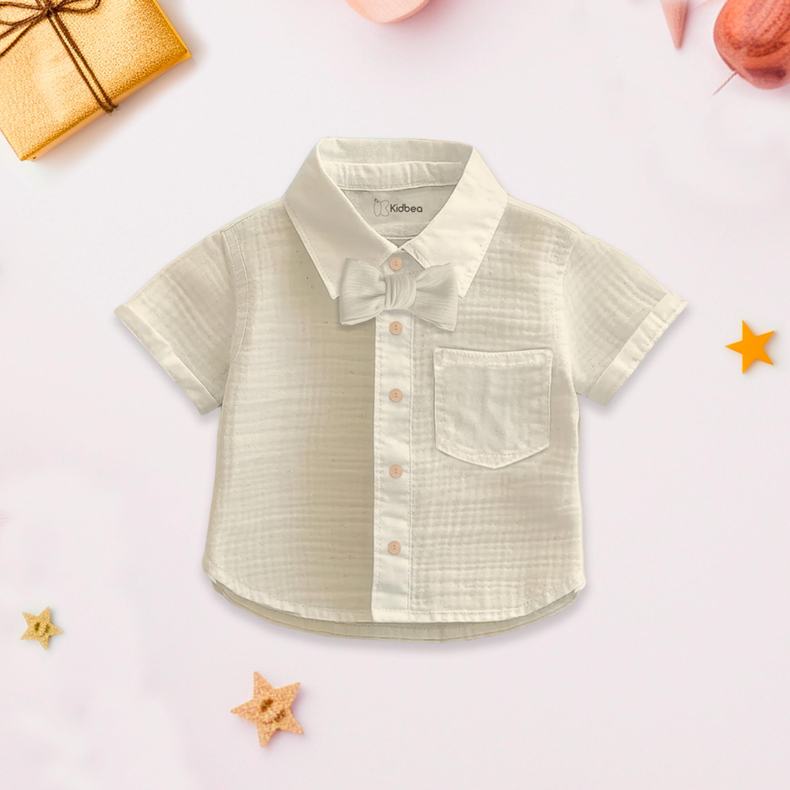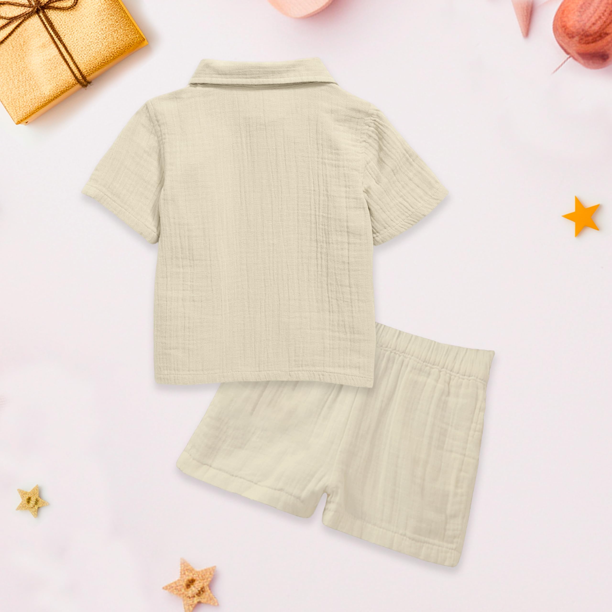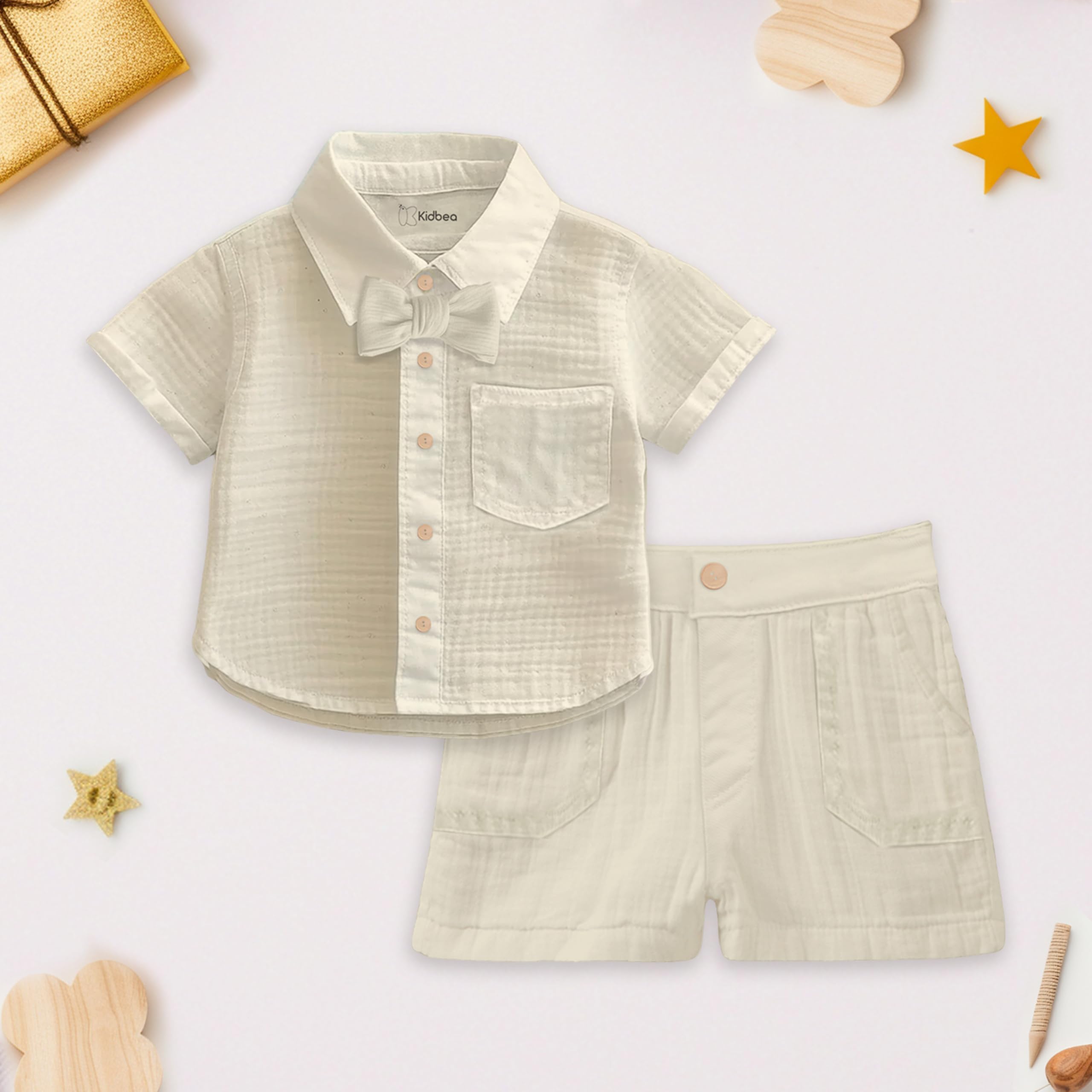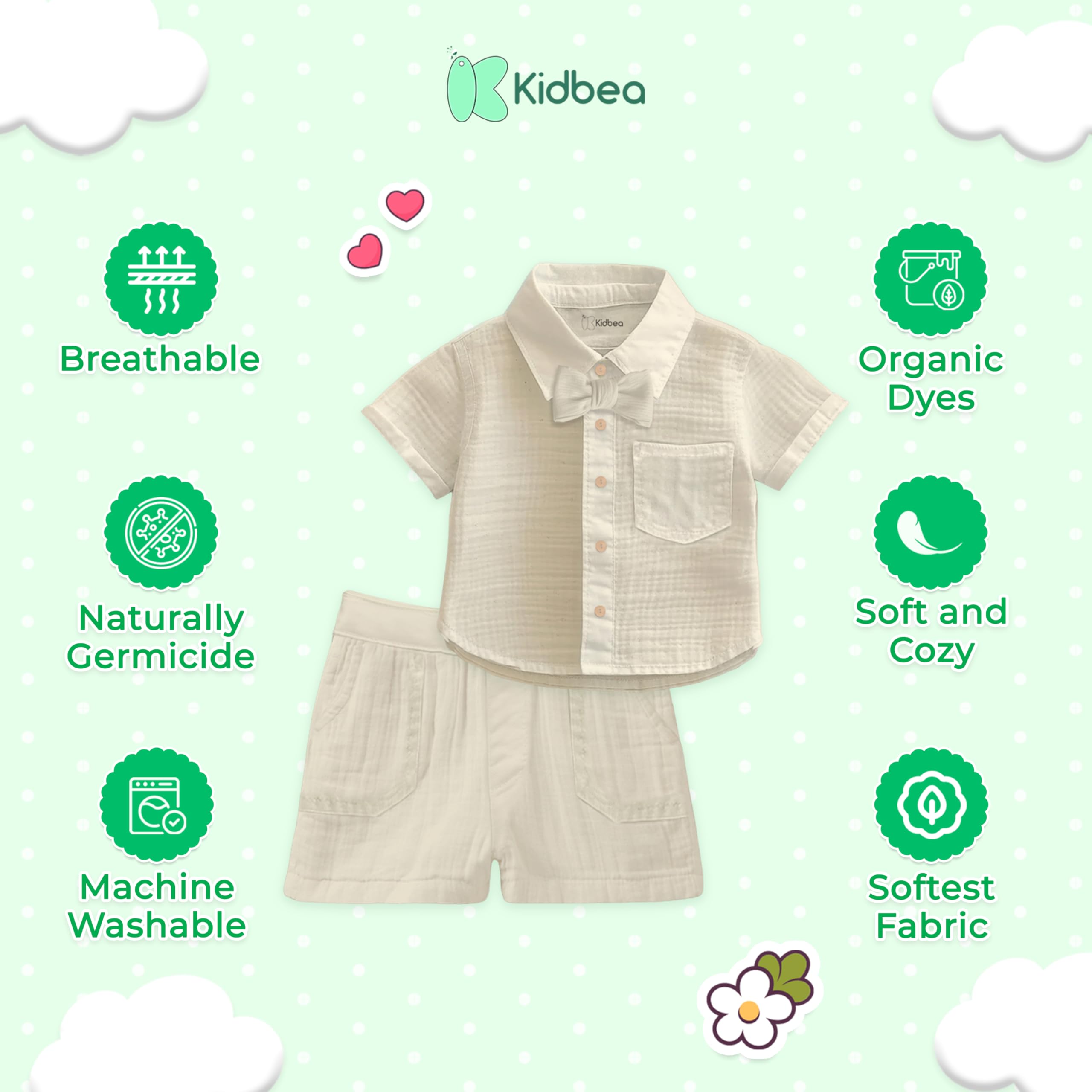 Kidbea Kids 100% Linen Solid Shirt & Pant Co-Ord Set | Elegant & Comfortable Summer Wear | Stylish Short-Sleeve Shirt With Bow & Comfy Shorts – Off White, 1-2 Years