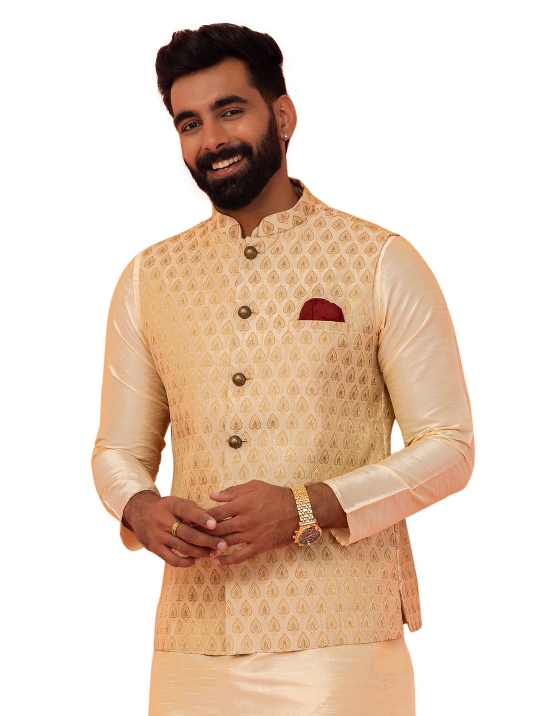 KISAH Men Gold-Toned Woven Design Nehru Jacket Ethnic Festive Waistcoat Cotton, Regular Fit
